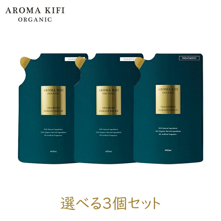 合成香料にはない、自然な香りをバスルームへ。[あす楽]ビジナル アロマキフィ オーガニックシャンプー 詰替 DAMAGE REPAIR 400ml 選べる3個セット ダメージ パウダリー ローズ 香り 傷み 補修 パサつき アミノ酸 精油 アロマ AROMA KIFI【区分A】|グラニーレプラス 楽天市場店